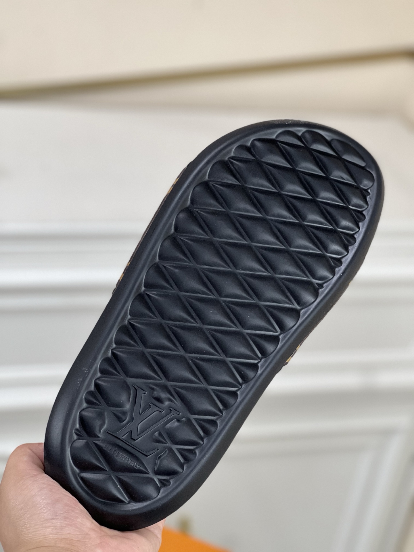 Crafted from high-quality rubber and embossed Monogram canvas, these slides combine effortless style with luxury craftsmanship.