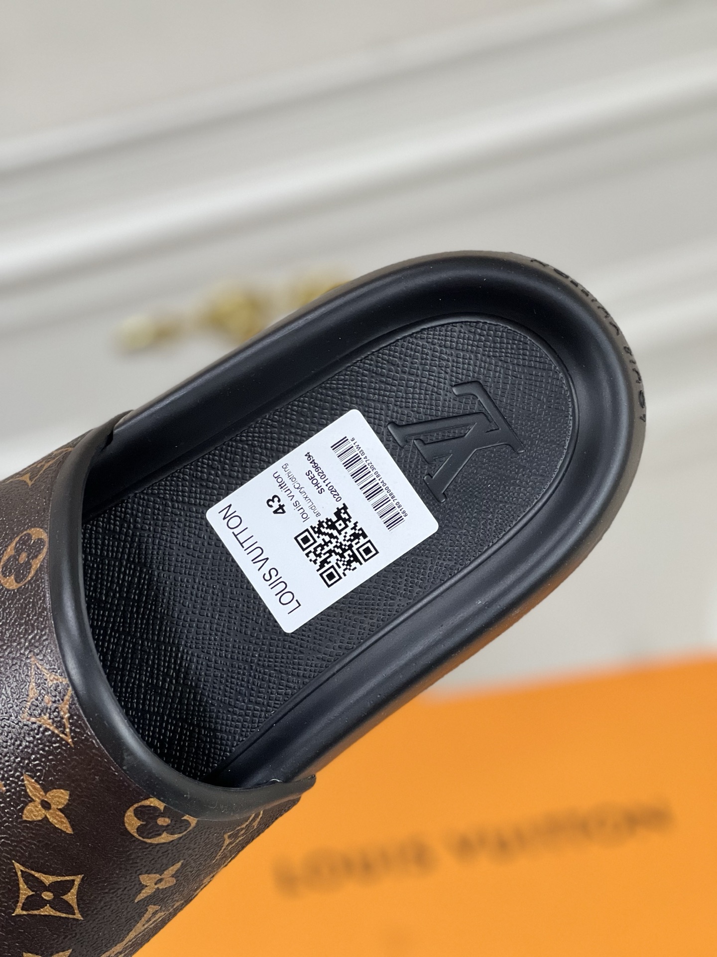 Experience refined comfort with the Louis Vuitton Waterfront Slide in the classic brown Monogram pattern.
